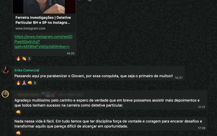 Além de contar com suporte vitalício da detetive Erika e equipe no grupo de alunos, haverá a possibilidade de se tornar agente da Ferreira Investigações após a formação (mediante avaliação e disponibilidade de casos na sua região).